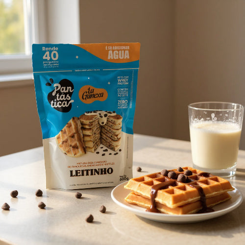 Pantástica is a powdered mix for American pancakes and waffles, made with oat flour and whey protein. It has a milky chocolate chip flavor, no added sugar, and you just need to add water to prepare it. It's a product of the La Ganexa brand, aimed at those seeking convenience and high protein value.