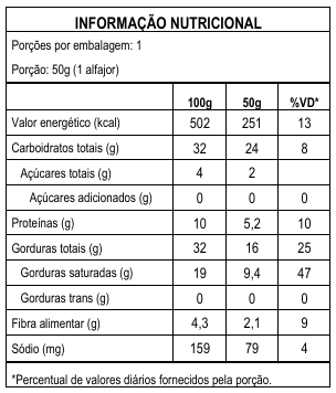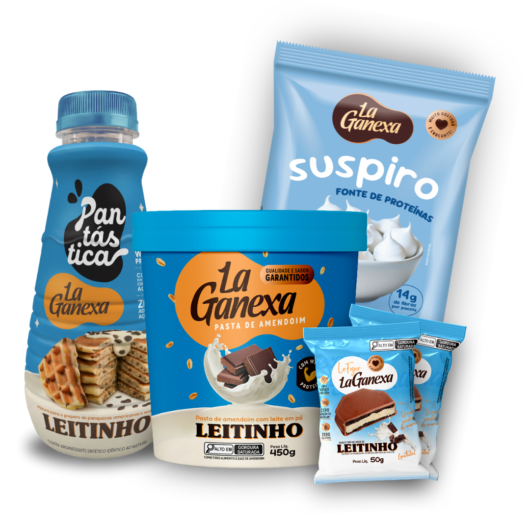 Alfajor: Pasta de amendoim sabor Leitinho La Ganexa, maltitol, gordura vegetal, farinha de arroz, amido de mandioca, leite desnatado em pó, batata desidratada, polidextrose, sal, emulsificantes lecitina de soja e pgpr, aromatizantes, espessante goma xantana e edulcorante stevia. NÃO CONTÉM GLÚTEN. CONTÉM LACTOSE.