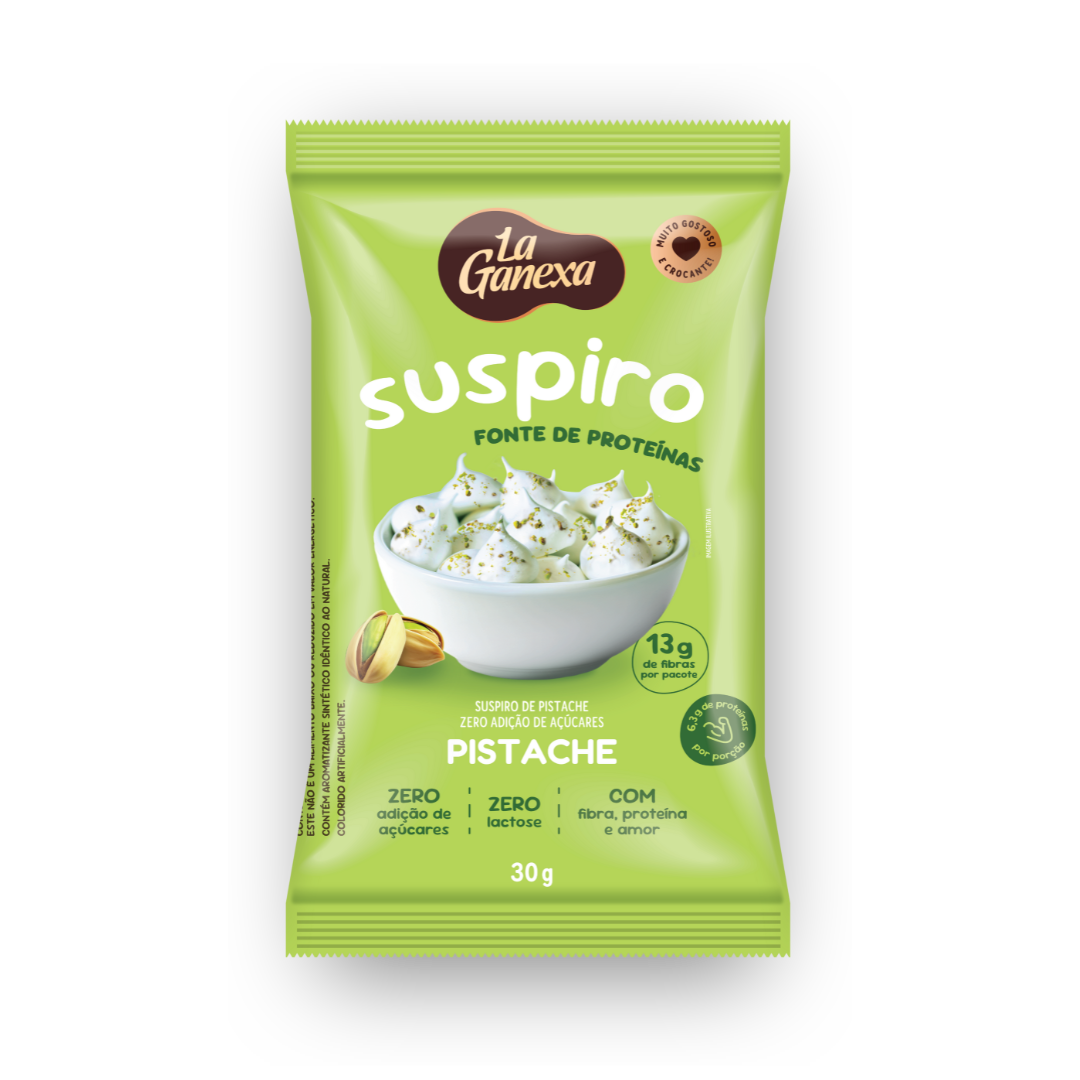 Suspiro: Ingredientes: polidextrose, clara de ovo em pó, isomalto-oligossacarídeo de mandioca em pó, pistache triturado, sal rosa fino iodado, aromatizantes, edulcorante sucralose e corante verde folha (corantes tartrazina e azul brilhante FCF). ALÉRGICOS: CONTÉM PISTACHE E DERIVADOS DE OVO. PODE CONTER LEITE E SOJA. NÃO CONTÉM LACTOSE. NÃO CONTÉM GLÚTEN. Alérgicos: Contém pistache e derivados de ovo. Pode conter leite e soja. Não contém lactose. Não contém glúten.