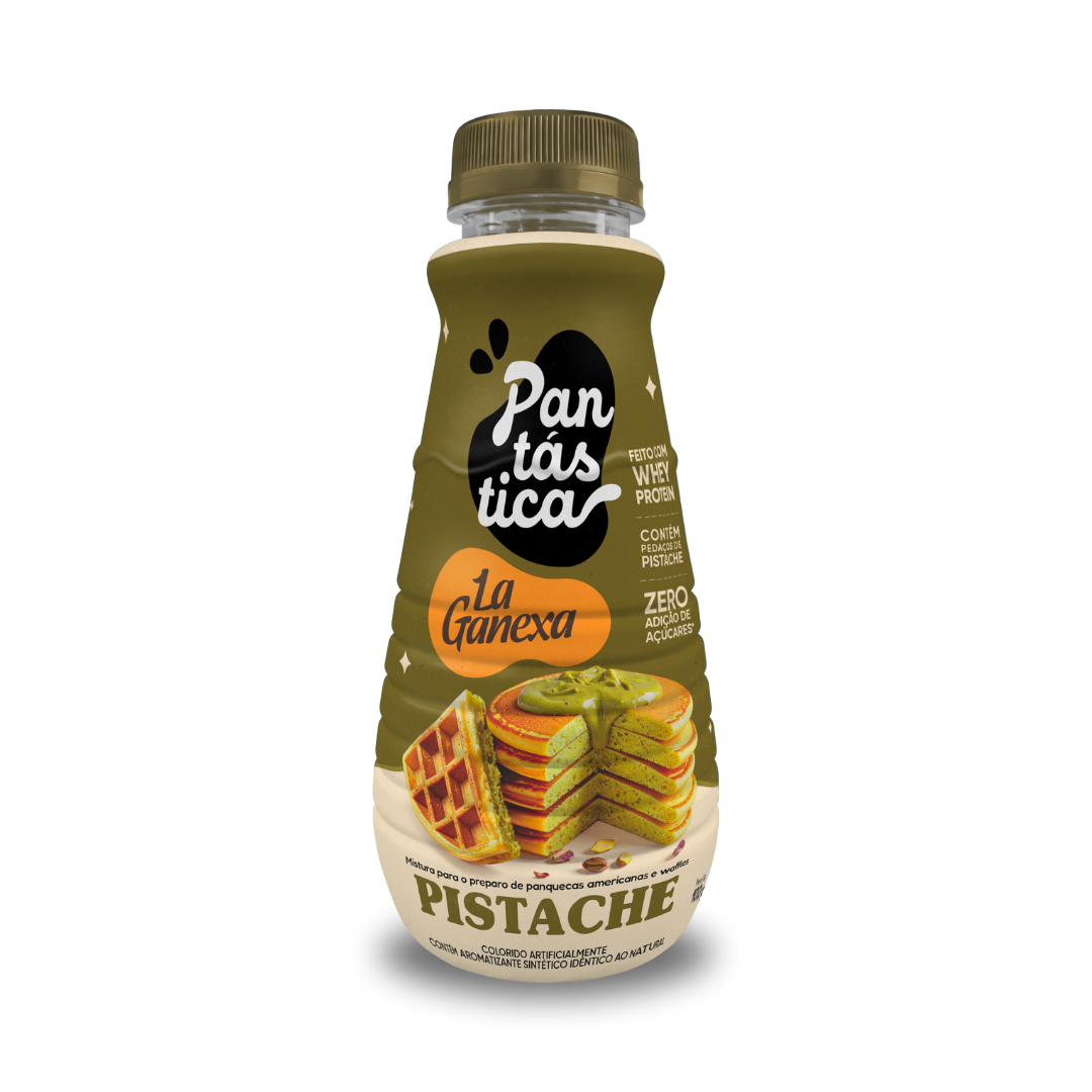 Panqueca: Farinha de aveia, soro de leite em pó parcialmente desmineralizado, fécula de mandioca, pistache triturado, whey protein sabor baunilha (proteína de soro do leite concentrada, aromatizante e edulcorante sucralose), sal fermentos químicos INS 500(ii), INS 541(i) e INS 450(i), estabilizante INS 415, aroma idêntico ao natural de pistache, edulcorante sucralose, corantes tartrazina e INS 133. CONTÉM LACTOSE. ALÉRGICOS: CONTÉM PISTACHES E DERIVADOS DE AVEIA E LEITE. PODE CONTER TRIGO, TRITICALE, CENTEIO, CEVADA, SOJA, AMENDOIM, AMÊNDOA, AVELÃS, CASTANHA-DE-CAJU, CASTANHA-DO-PARÁ, NOZES E CASTANHAS. CONTÉM GLÚTEN.