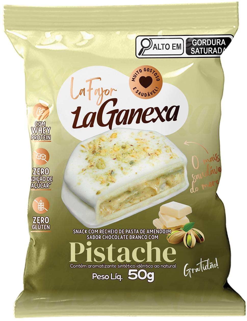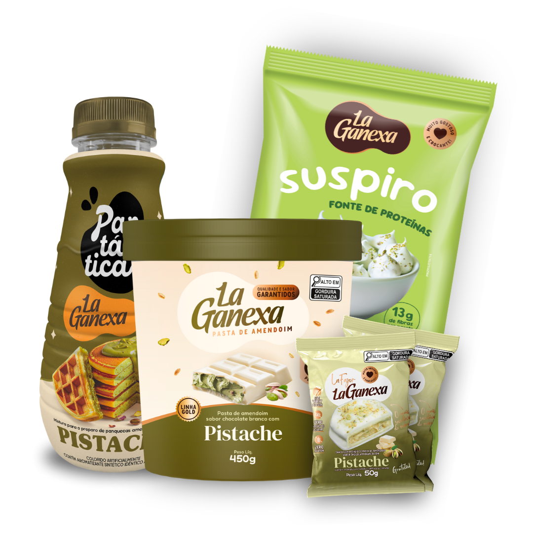 Alfajor: Maltitol, gordura vegetal, pasta de amendoim sabor pistache La Ganexa, leite desnatado em pó, amido de mandioca, farinha de arroz, polidextrose, soro de leite em pó, pistache moído, sal, emulsificantes lecitina de soja e polirricinoleato de poliglicerol, aromatizantes, espessante goma xantana e edulcorante steviae e amor. NÃO CONTÉM GLÚTEN. CONTÉM LACTOSE. ALÉRGICOS: CONTÉM PISTACHE E DERIVADO DE AMENDOIM, LEITE E SOJA. PODE CONTER AVELÃ.