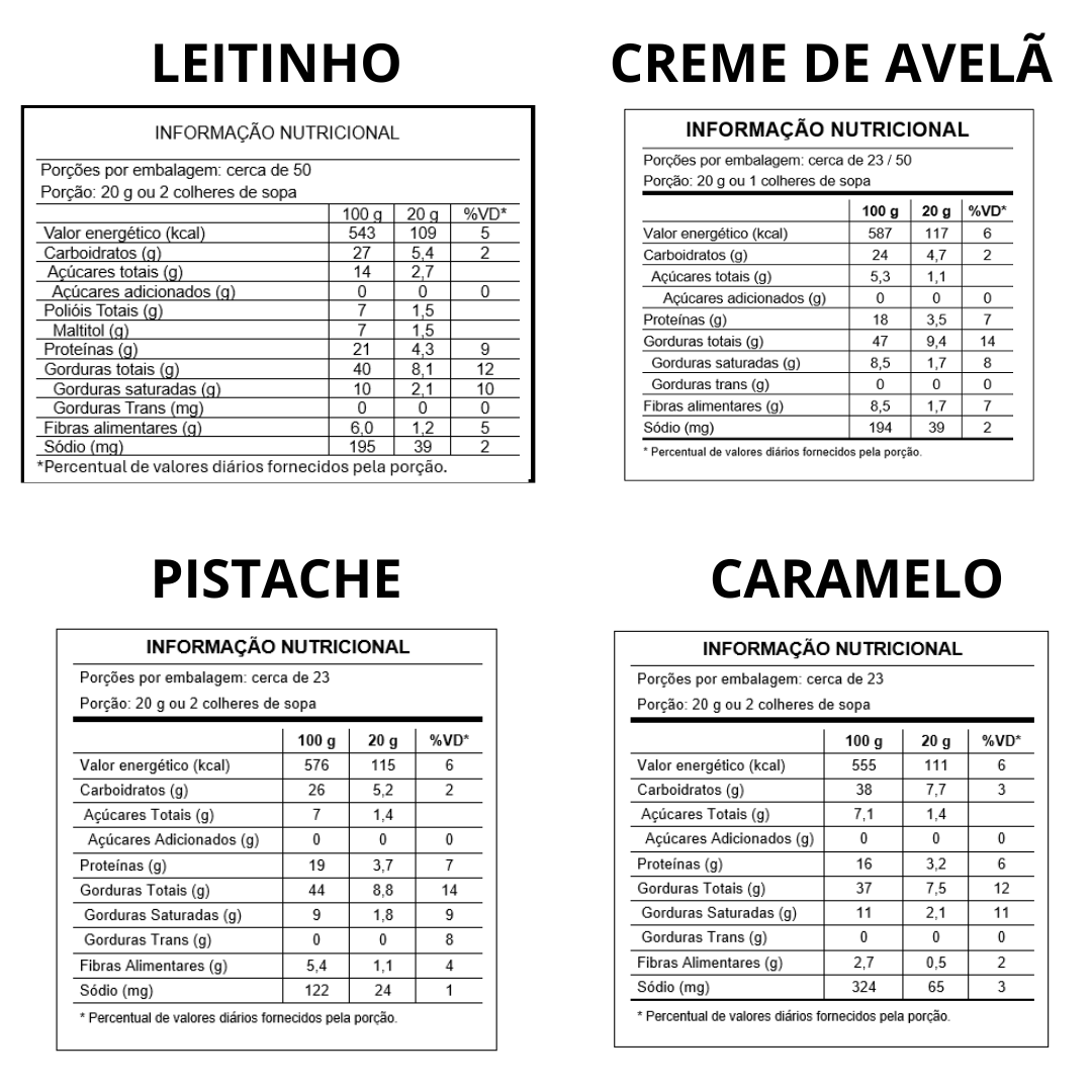 O Kit contém amendoim, derivados de leite (lactose), soja, pistache, avelã e derivados de ovo (em alguns sabores). Pode conter traços de outras oleaginosas como castanhas, nozes e macadâmias.